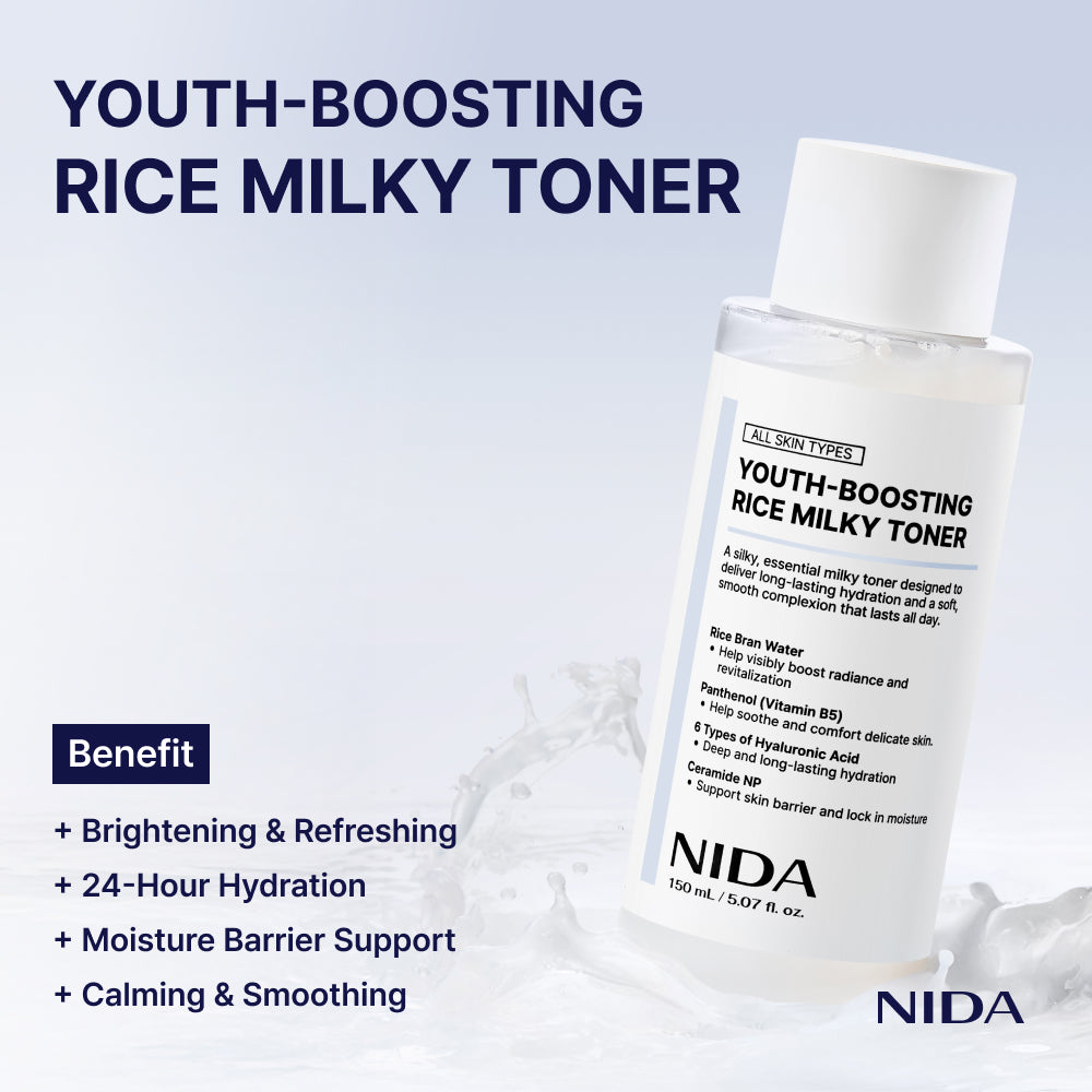 🌾 Rice Milky Toner: Rice Bran Water, 6 Types of Hyaluronic Acid, Panthenol, Ceramide NP.