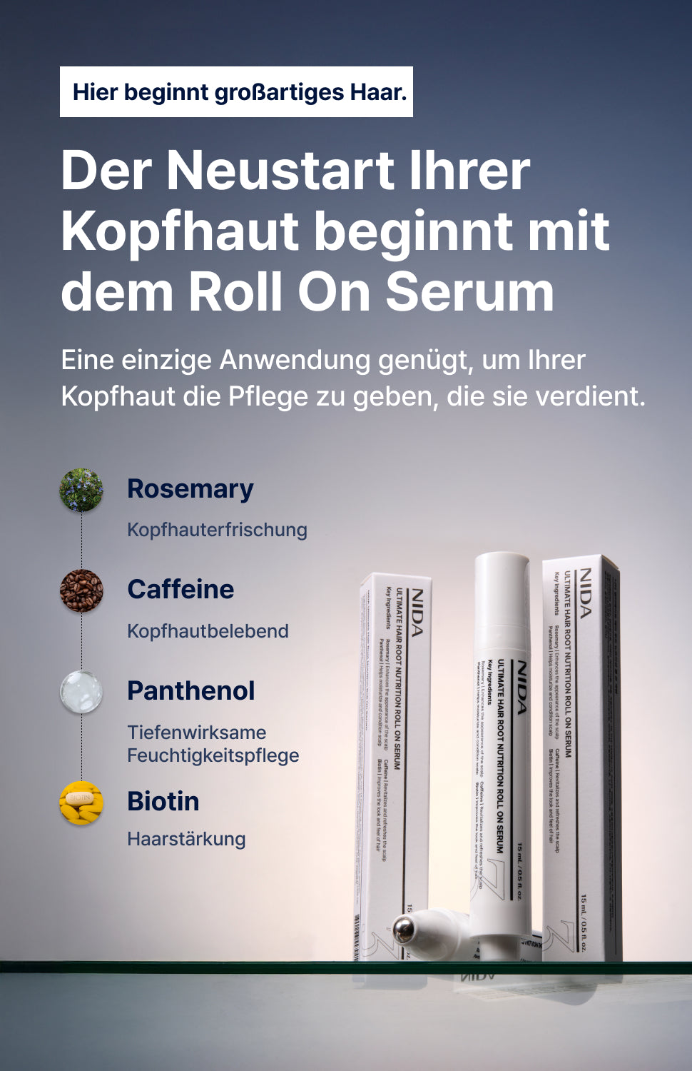 NIDA Roll-On Serum gives you thicker-looking hair and a refreshed scalp in just 30 seconds a day.