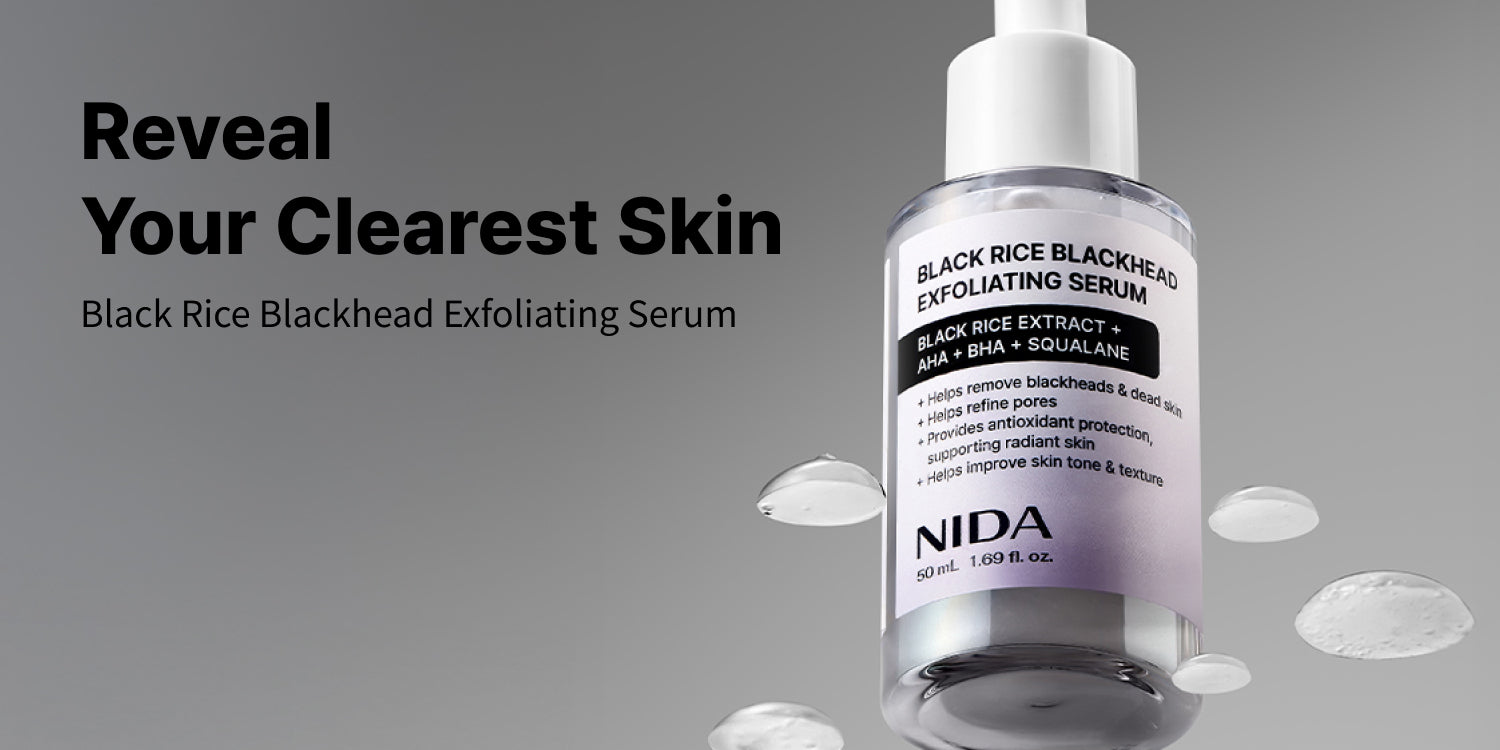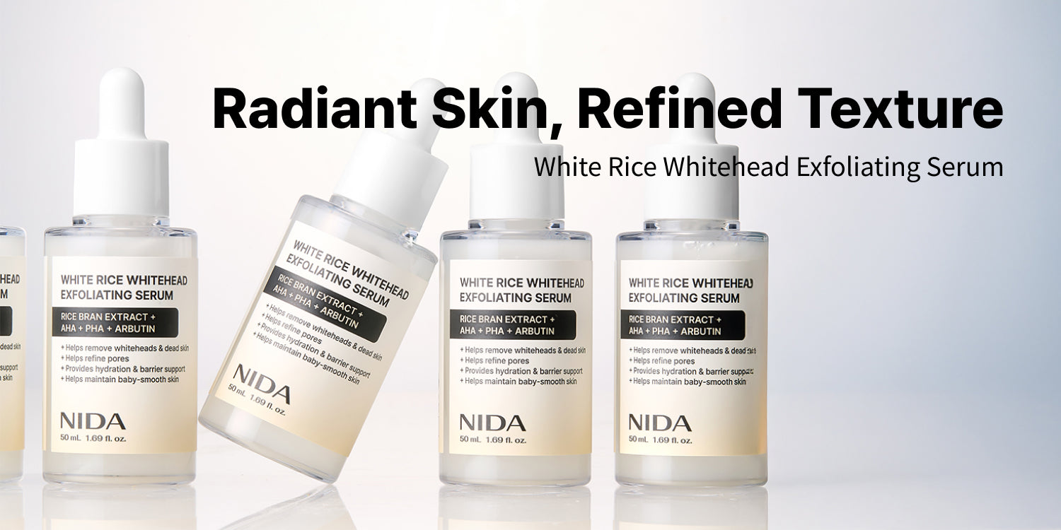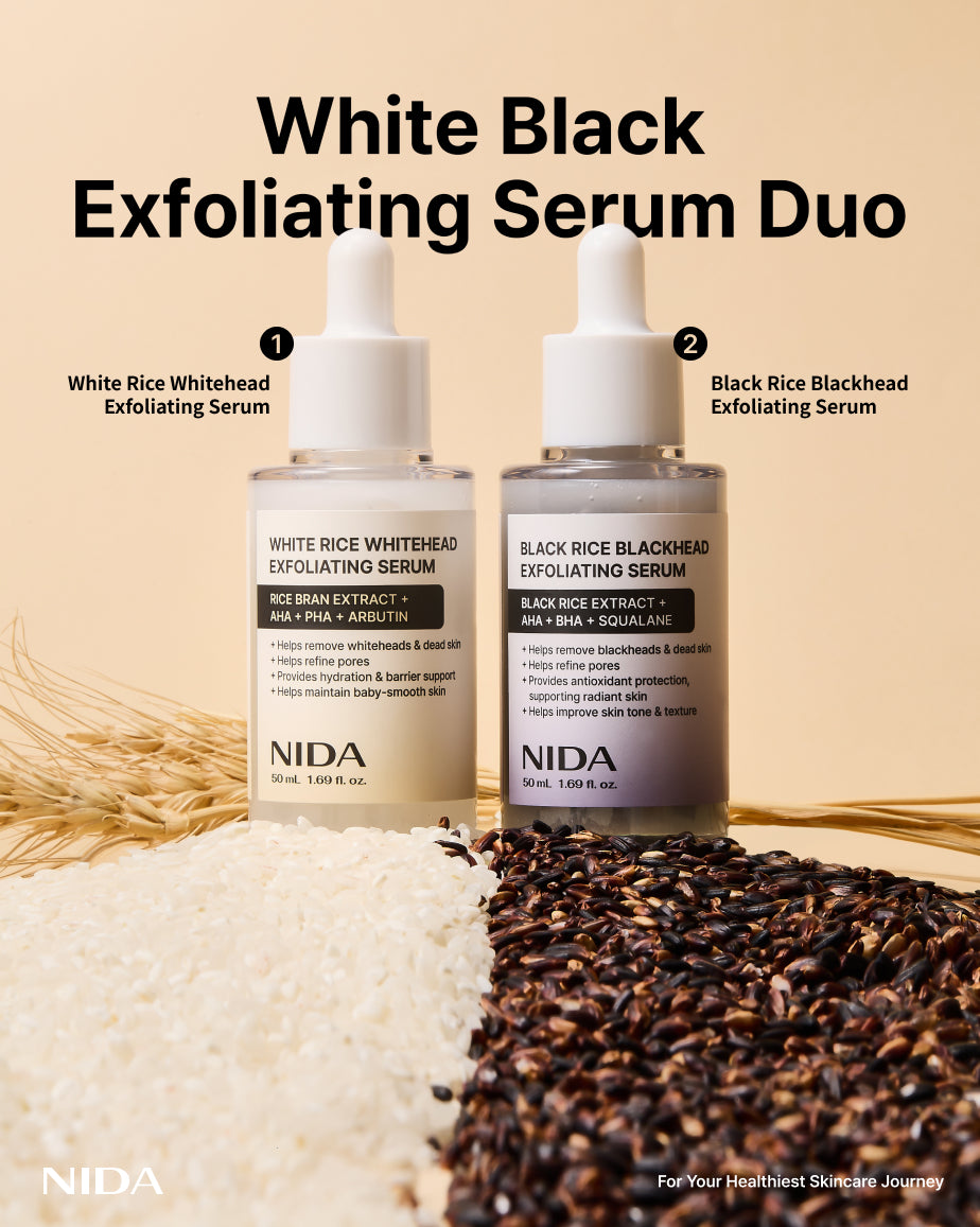 Glow clear, pore-perfect skin with NIDA's Rice Exfoliating Serums.