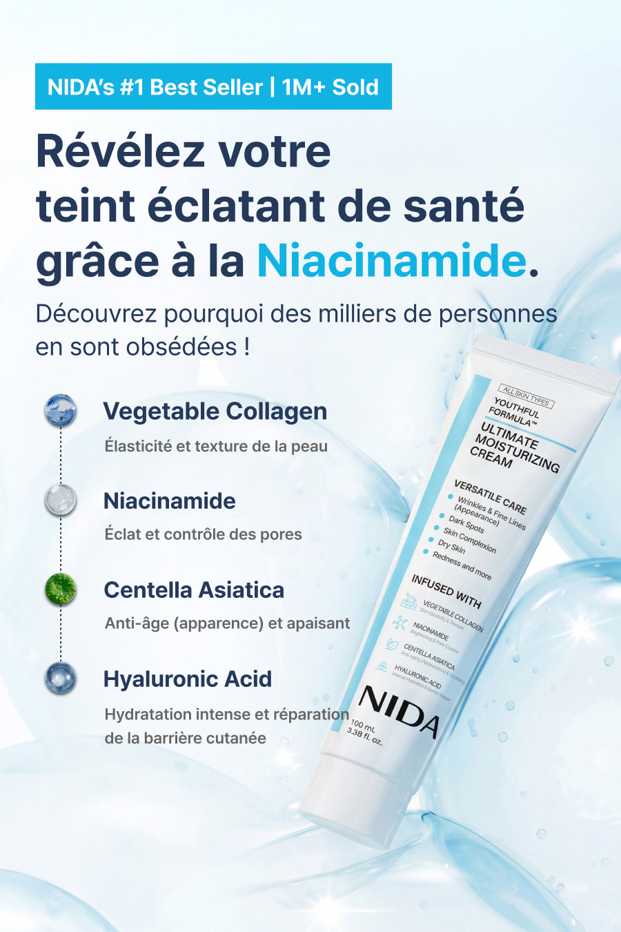 La niacinamide illumine les zones ternes et contribue à atténuer les taches brunes pour un teint plus uniforme et éclatant.