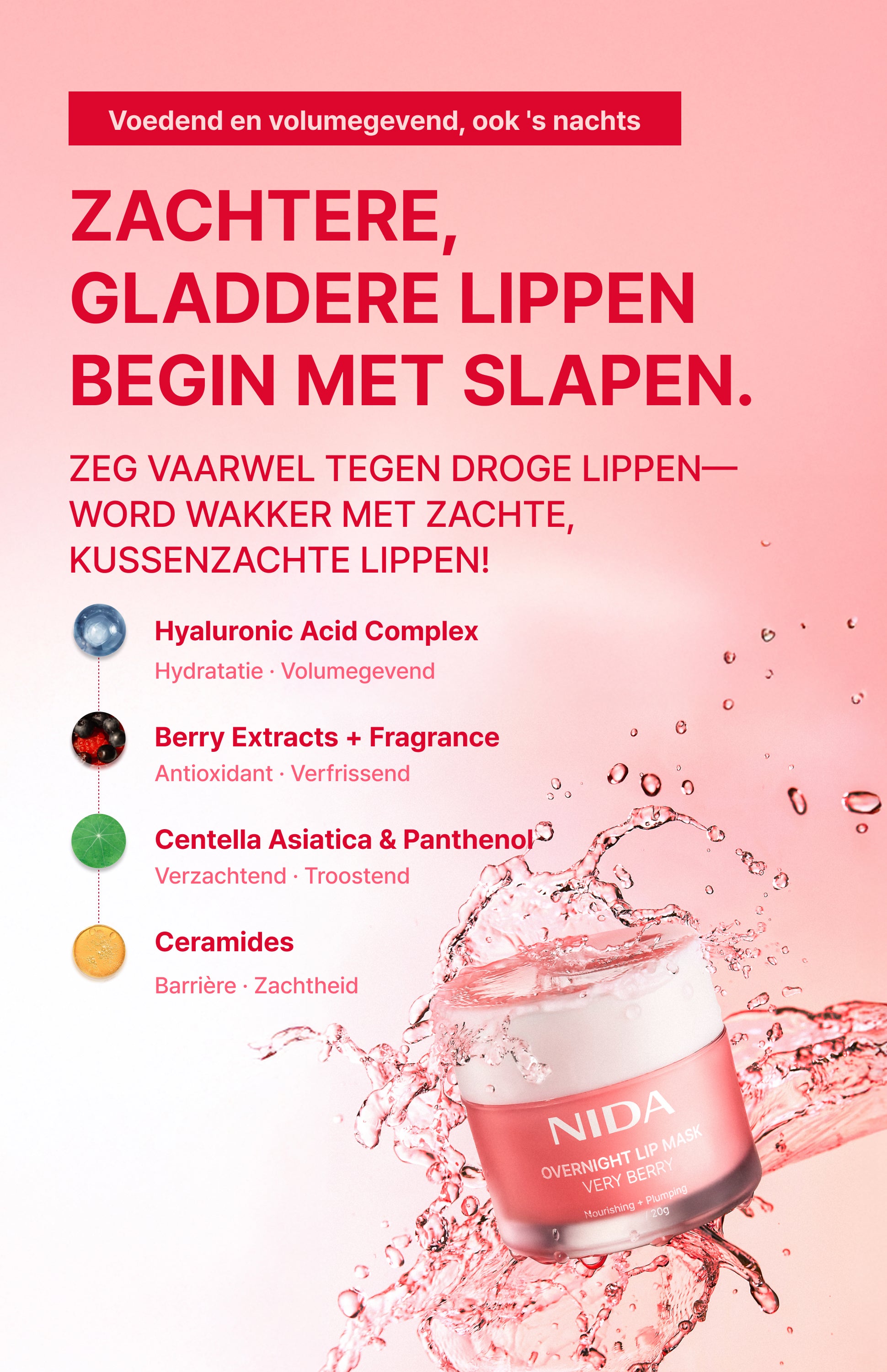 Werkt terwijl je slaapt en helpt de zachte, comfortabele uitstraling van je lippen te herstellen en te behouden, zodat ze er 's ochtends weer als nieuw uitzien.