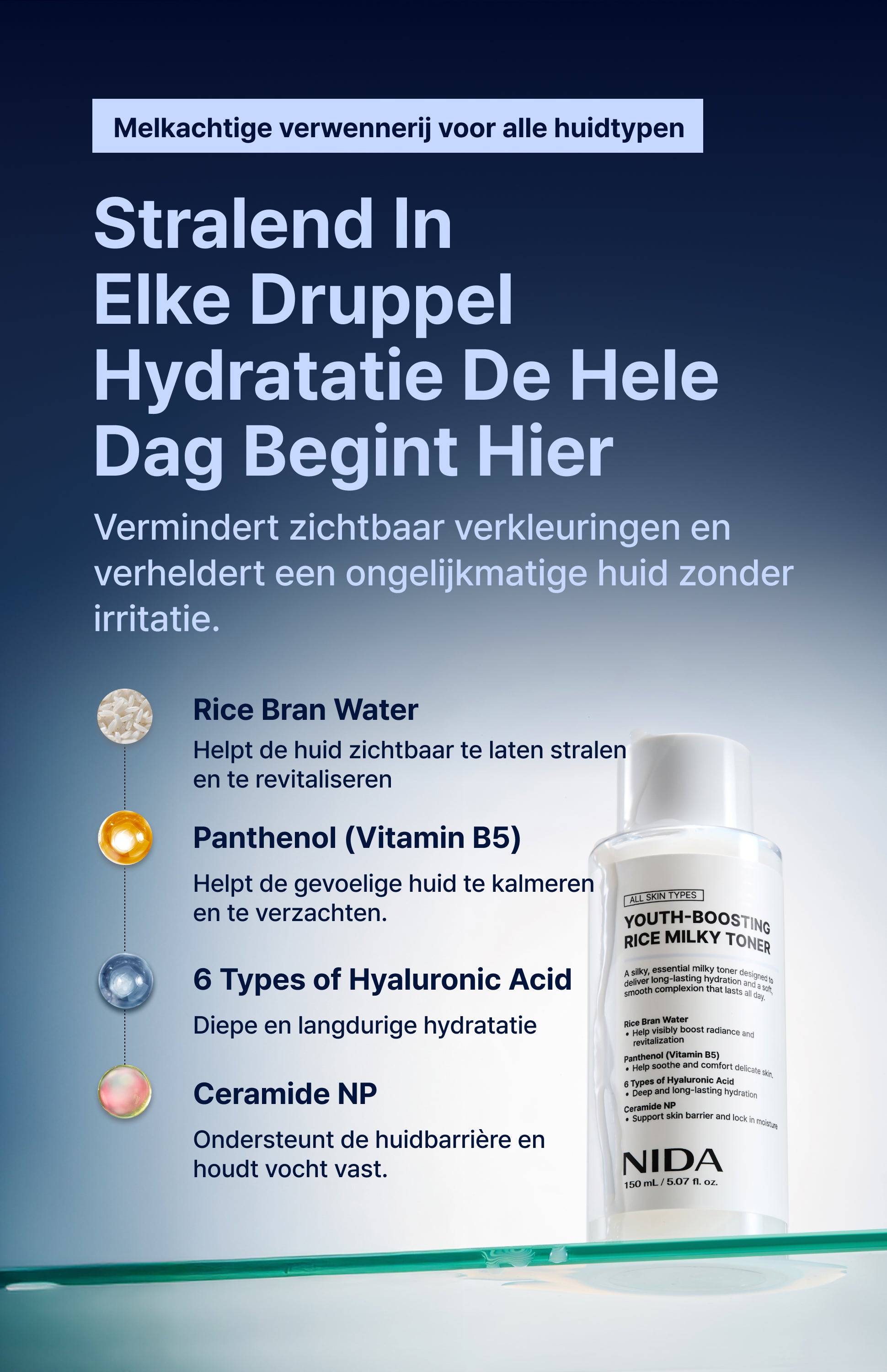 Een stralende rijstmelktoner voor langdurige hydratatie.