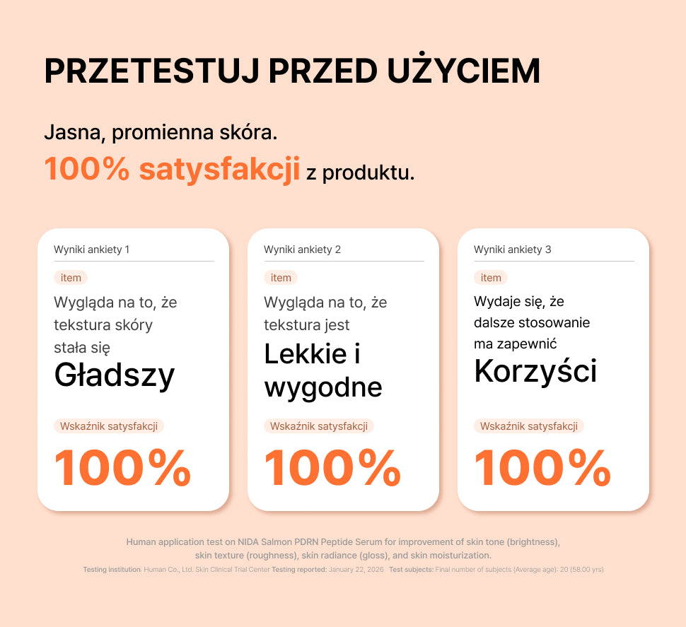 Po oczyszczeniu i tonizacji, nałóż odpowiednią ilość NIDA Salmon PDRN Peptide Serum na opuszki palców i delikatnie rozprowadź na twarz i szyję, omijając okolice oczu. Delikatnie wklep aż do całkowitego wchłonięcia, następnie nałóż NIDA Moisturizing Cream.