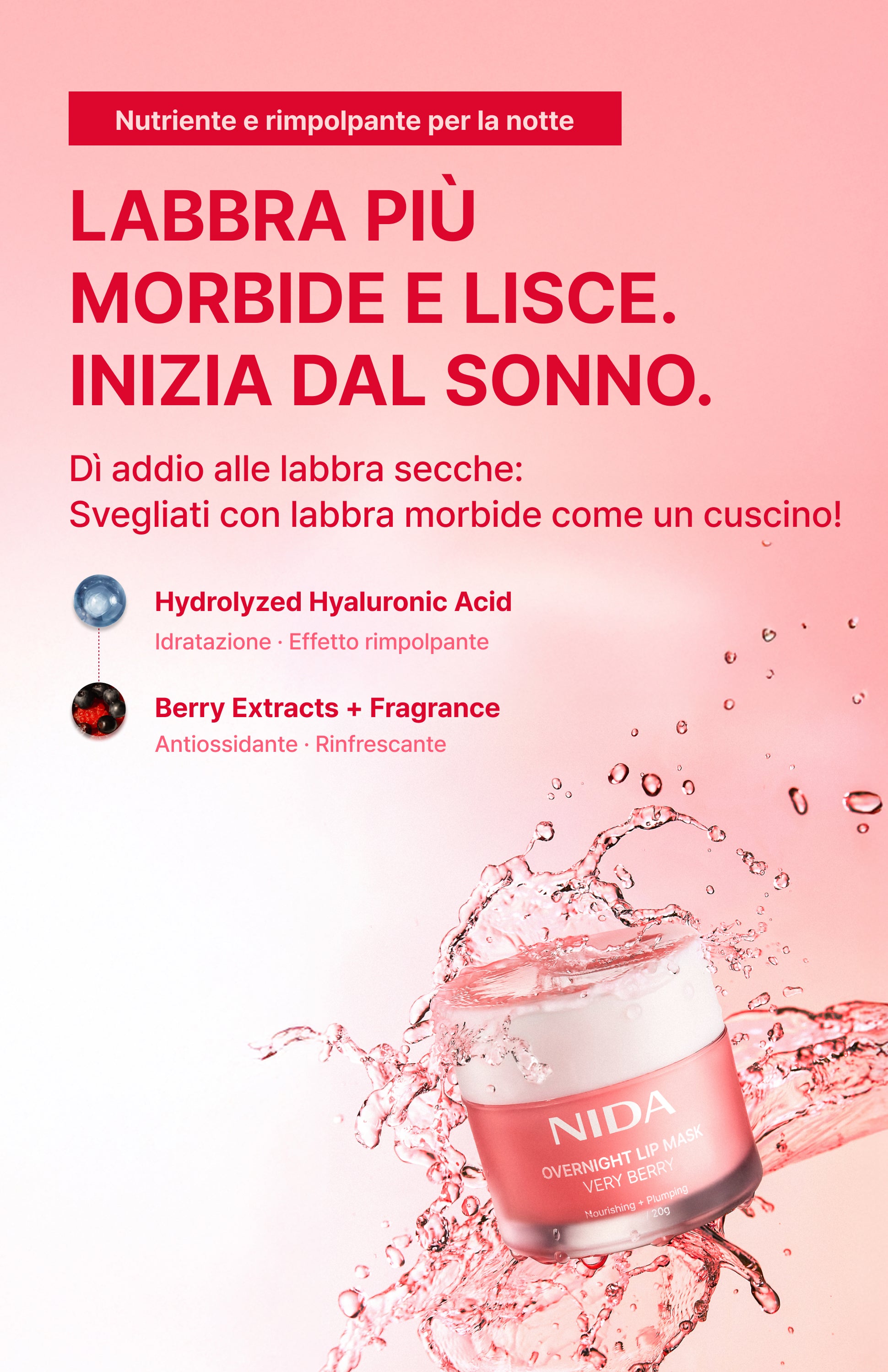 Agisce durante il sonno per contribuire a ripristinare e mantenere l'aspetto di labbra morbide e idratate fino al mattino.